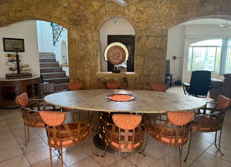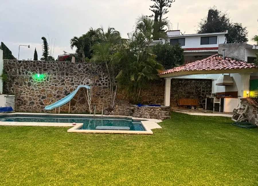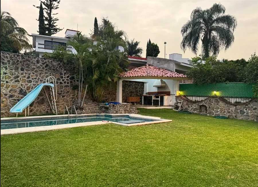 Planta baja: Sala, comedor, cocina integral, una recámara con baño completo, un baño adicional, terraza, jardín, cuarto de servicio, alberca, palapa y jacuzzi.
